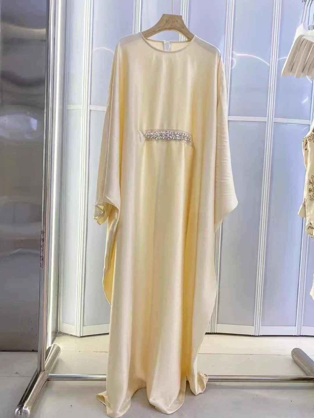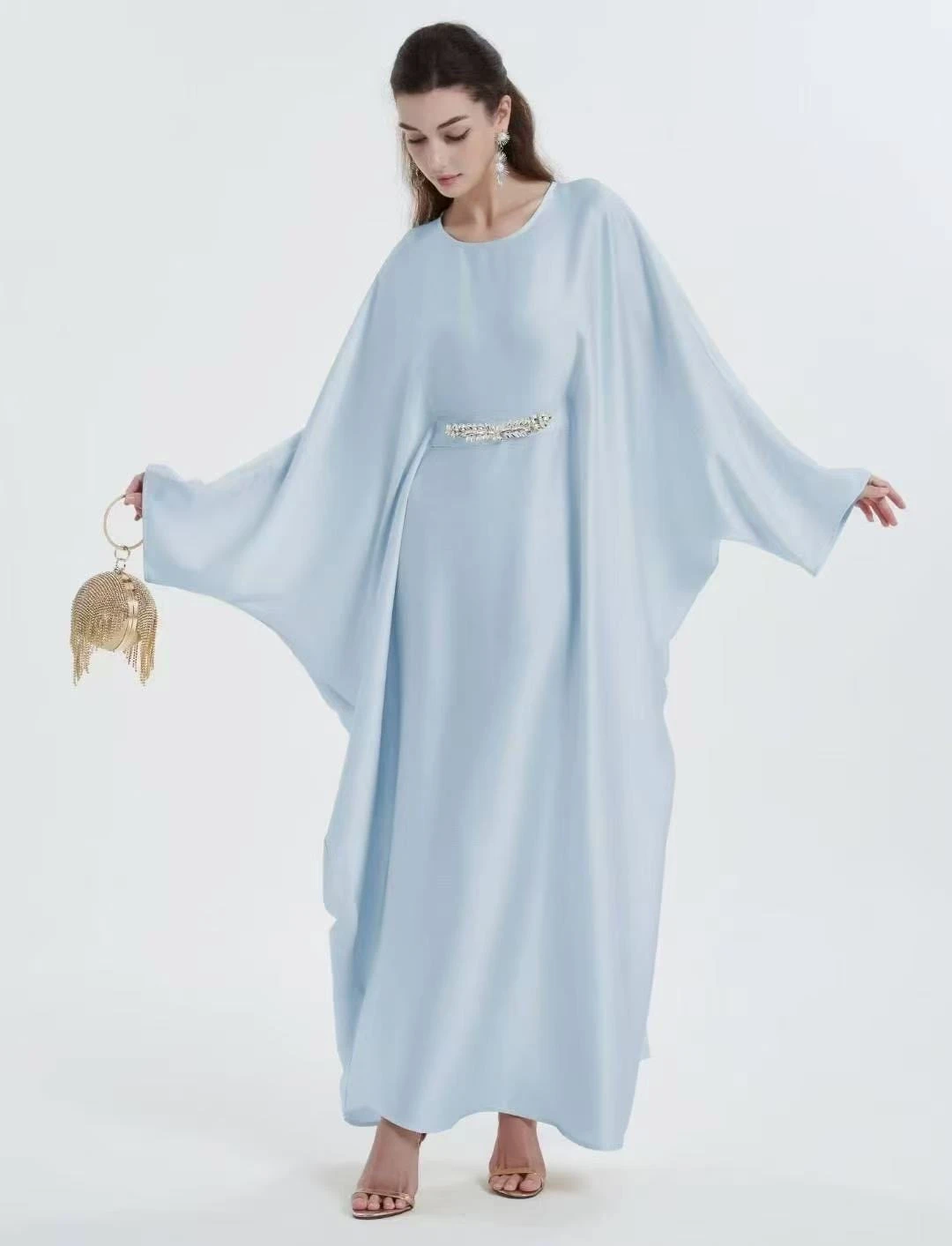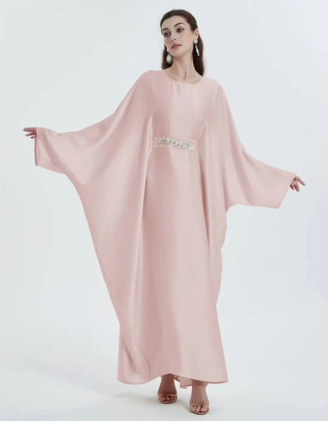 A sophisticated, flowing kaftan dress designed for effortless elegance. Crafted in a soft blush pink fabric, it features wide batwing sleeves and a flattering loose silhouette. The waistline is accented with a delicate embellished belt detail, adding a touch of glamour. Perfect for evening occasions, weddings, or special events.